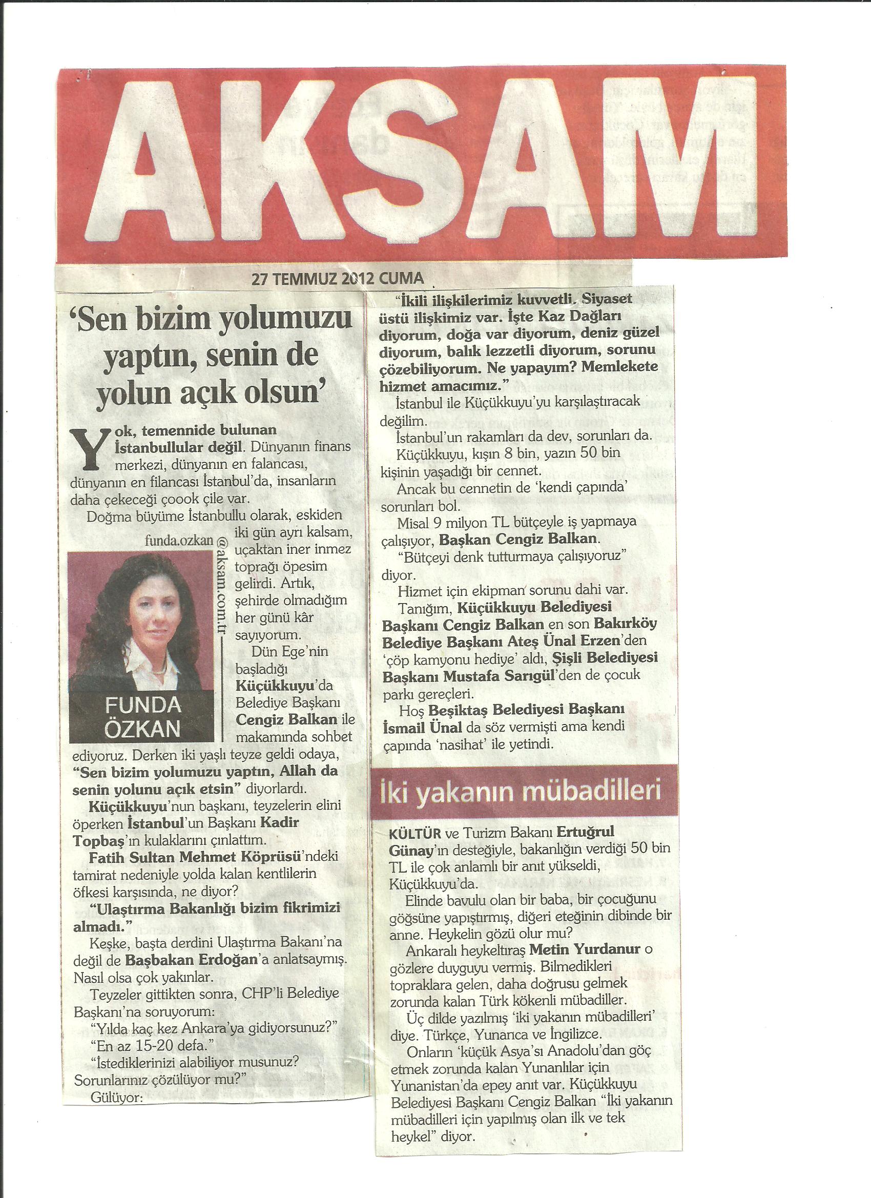 27 TEMMUZ 2012 AKŞAM GAZETESİ’NDE FUNDA ÖZKAN’IN KALEMİNDEN KÜÇÜKKUYU HABERİ…..